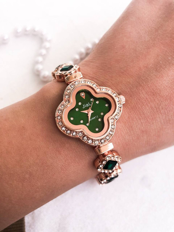 👚نام : ساعت مجلسی زنانه یا دخترانه برند Jial بند استیل رزگلد نگین سبز صفحه سبز