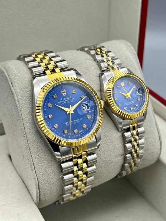 👗ست ساعت رولکس زنانه و مردانه با هم بنداستیل دو رنگ نقره ای طلایی صفحه آبی