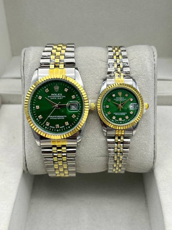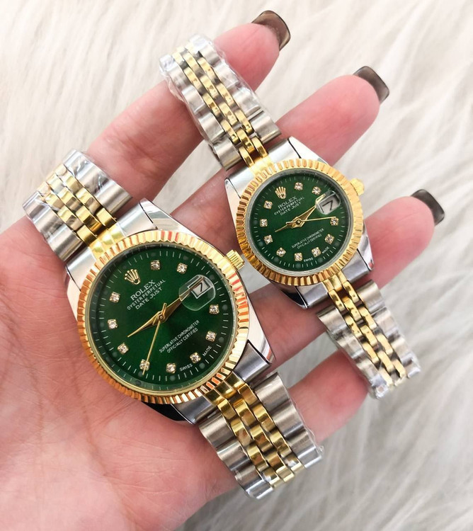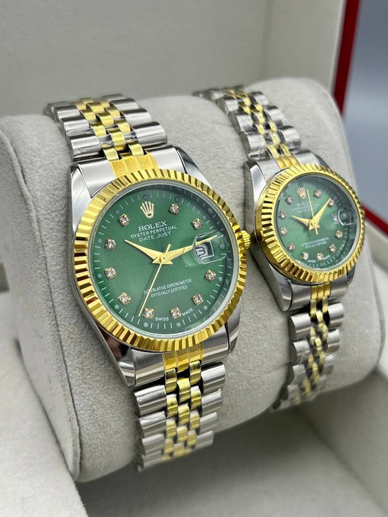 👗ست ساعت رولکس زنانه و مردانه با هم بنداستیل دو رنگ نقره ای طلایی صفحه سبز