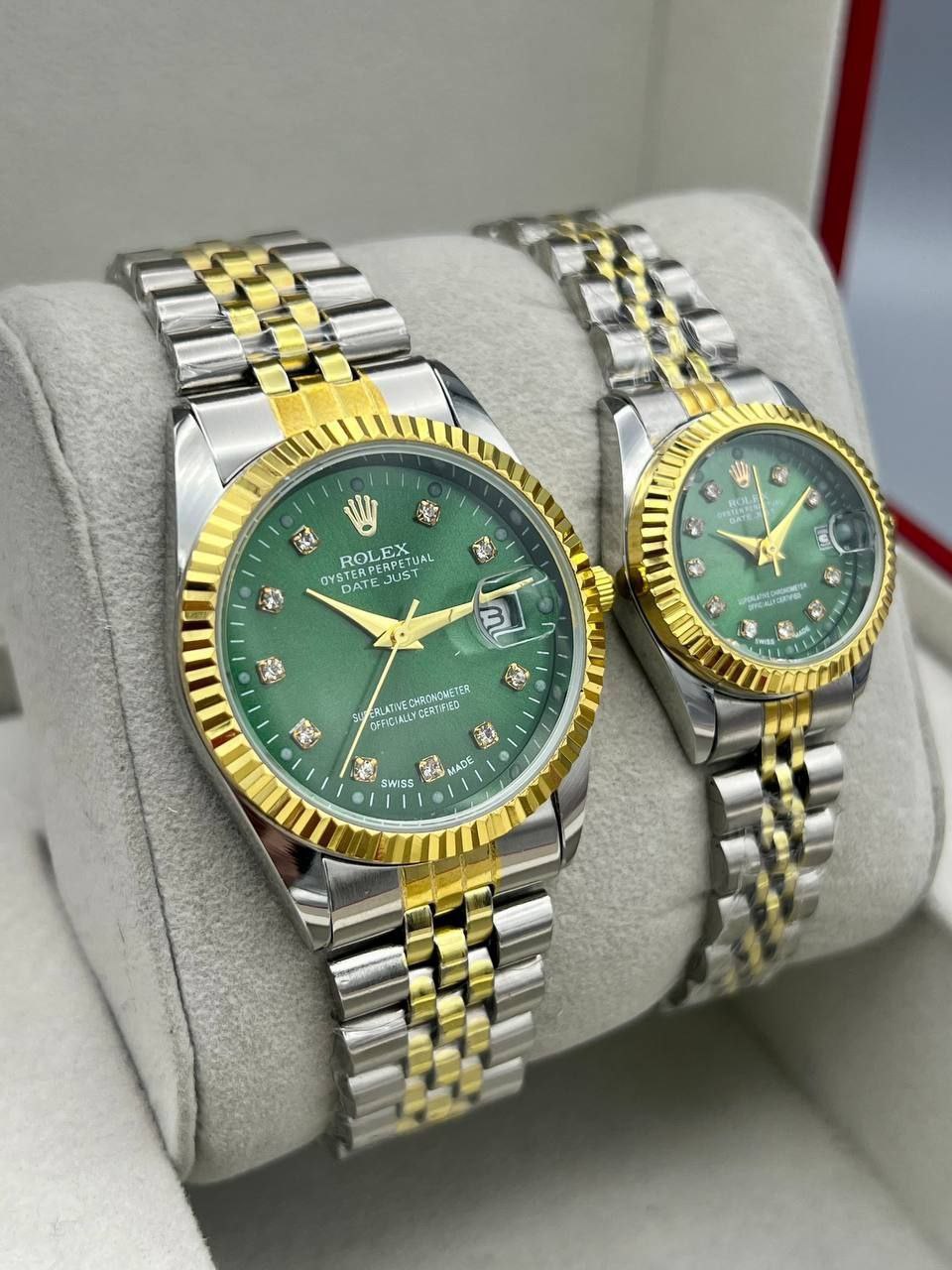 👗ست ساعت رولکس زنانه و مردانه با هم بنداستیل دو رنگ نقره ای طلایی صفحه سبز