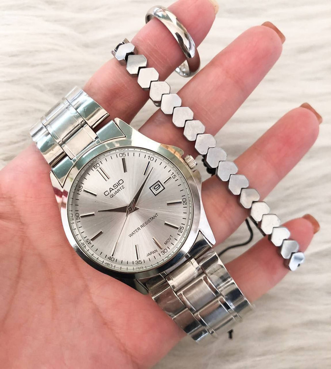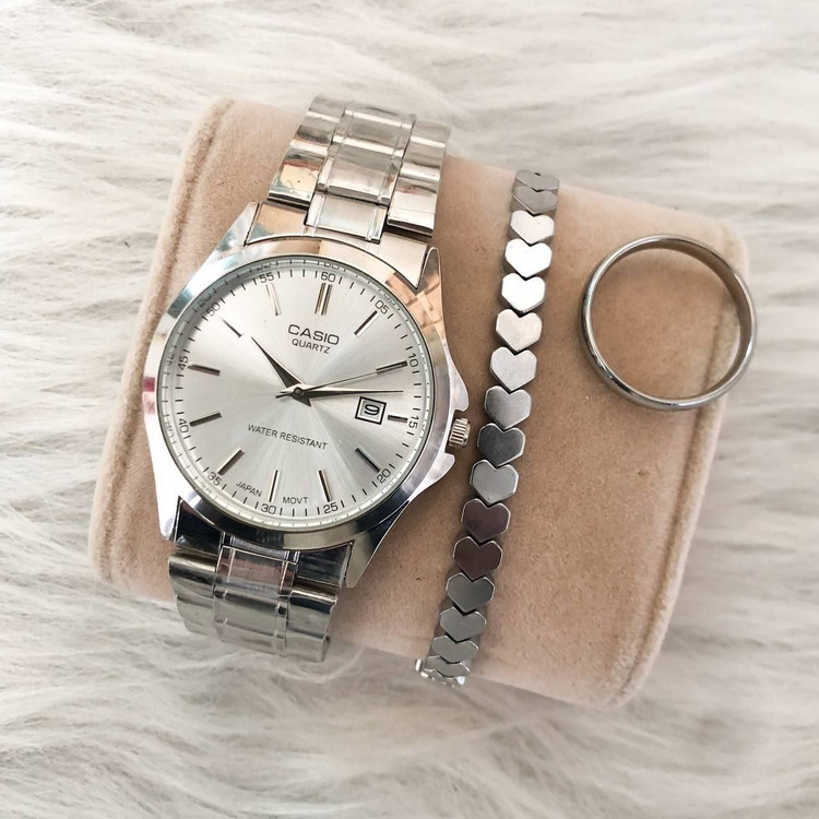 👚نام : ساعت کاسیو مردانه یا زنانه بند نقره ای صفحه سفید همراه با دستبند و حلقه