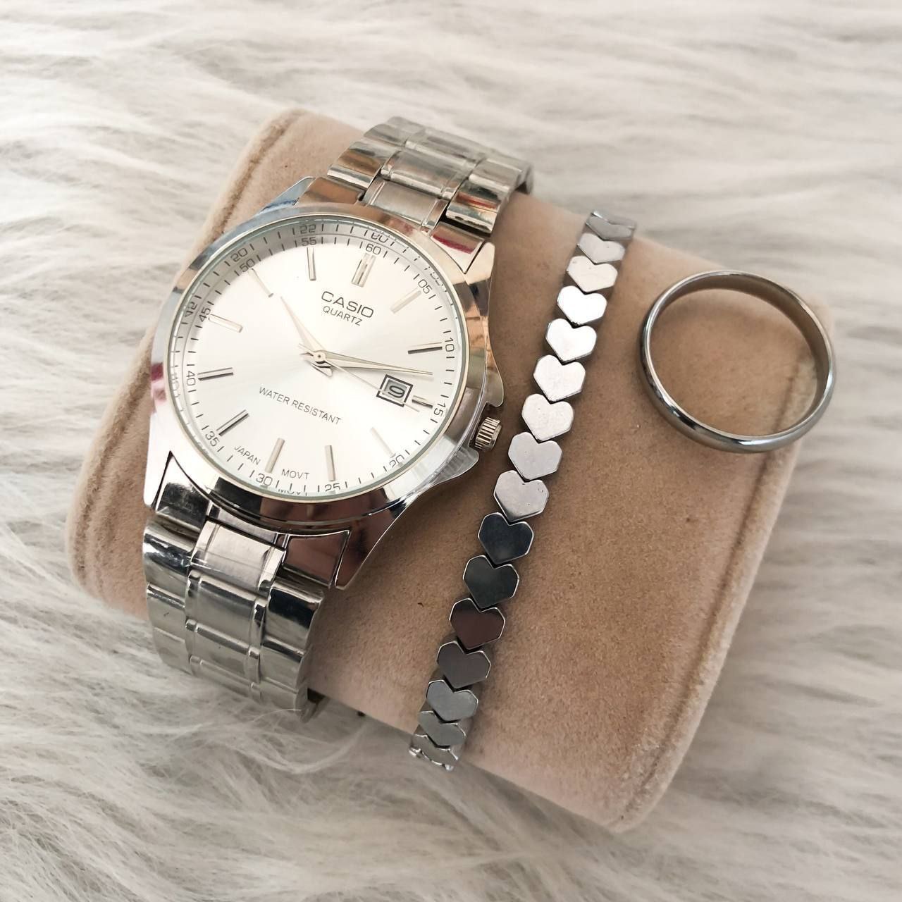 👚نام : ساعت کاسیو مردانه یا زنانه بند نقره ای صفحه سفید همراه با دستبند و حلقه