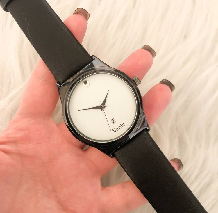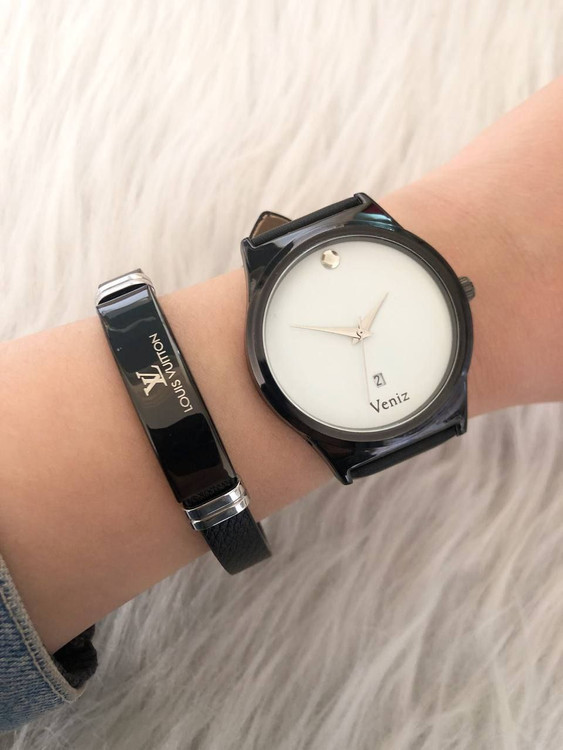 👚نام : ست ساعت مردانه یا پسرانه همراه با دستبند مارک ونیز بندچرم مشکی صفحه سفید. طرح موادو