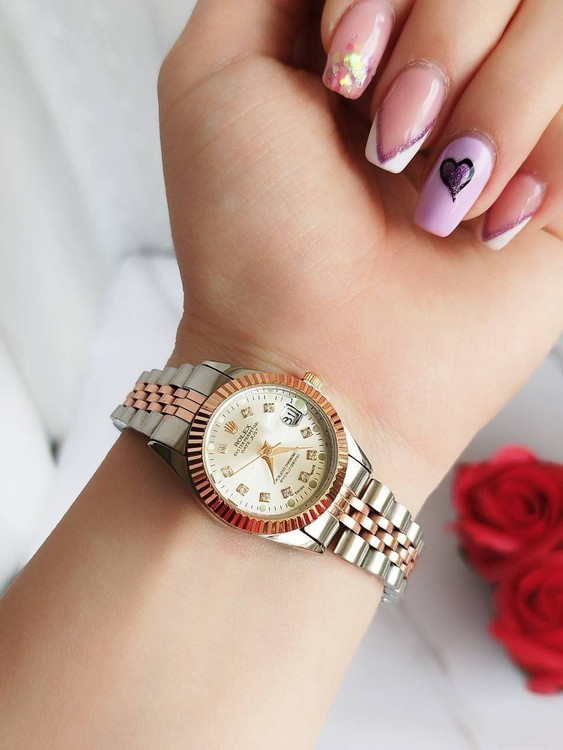 👗بنداستیل دورنگ نقره ای و رزگلد صفحه سفید . شیشه ذره بینی
