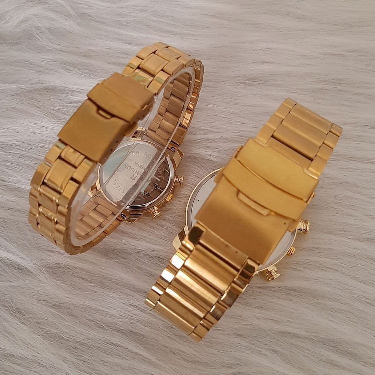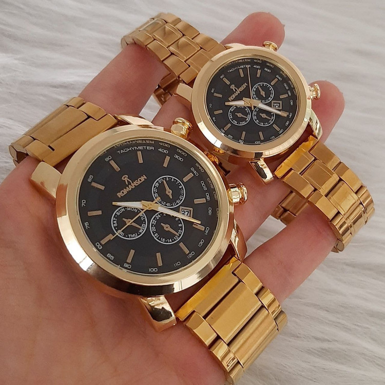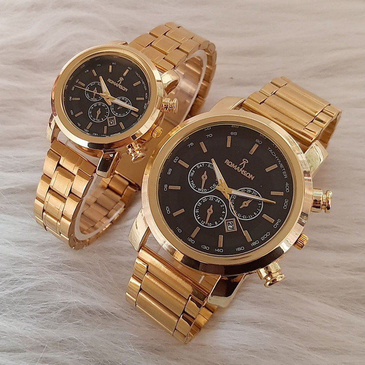 👚نام : ست ساعت زنانه و مردانه مارک رومانسون بنداستیل طلایی صفحه مشکی. طرح سه موتوره